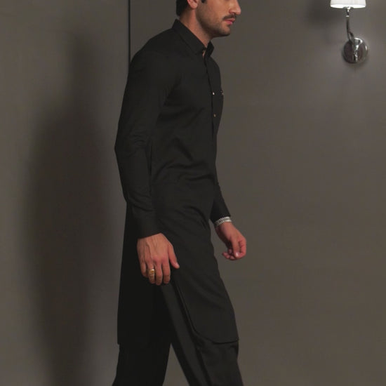 A luxurious black designer kameez shalwar in dobby fabric featuring a shirt collar adorned with gold accessory and a refined round hem, finished with metallic gold buttons. Enhanced with intricate cut-and-sew detailing on the front accented with rivets, and completed with a Shahid Afridi metal plate and the signature bat emblem on the left sleeve for an opulent, statement-making finish.