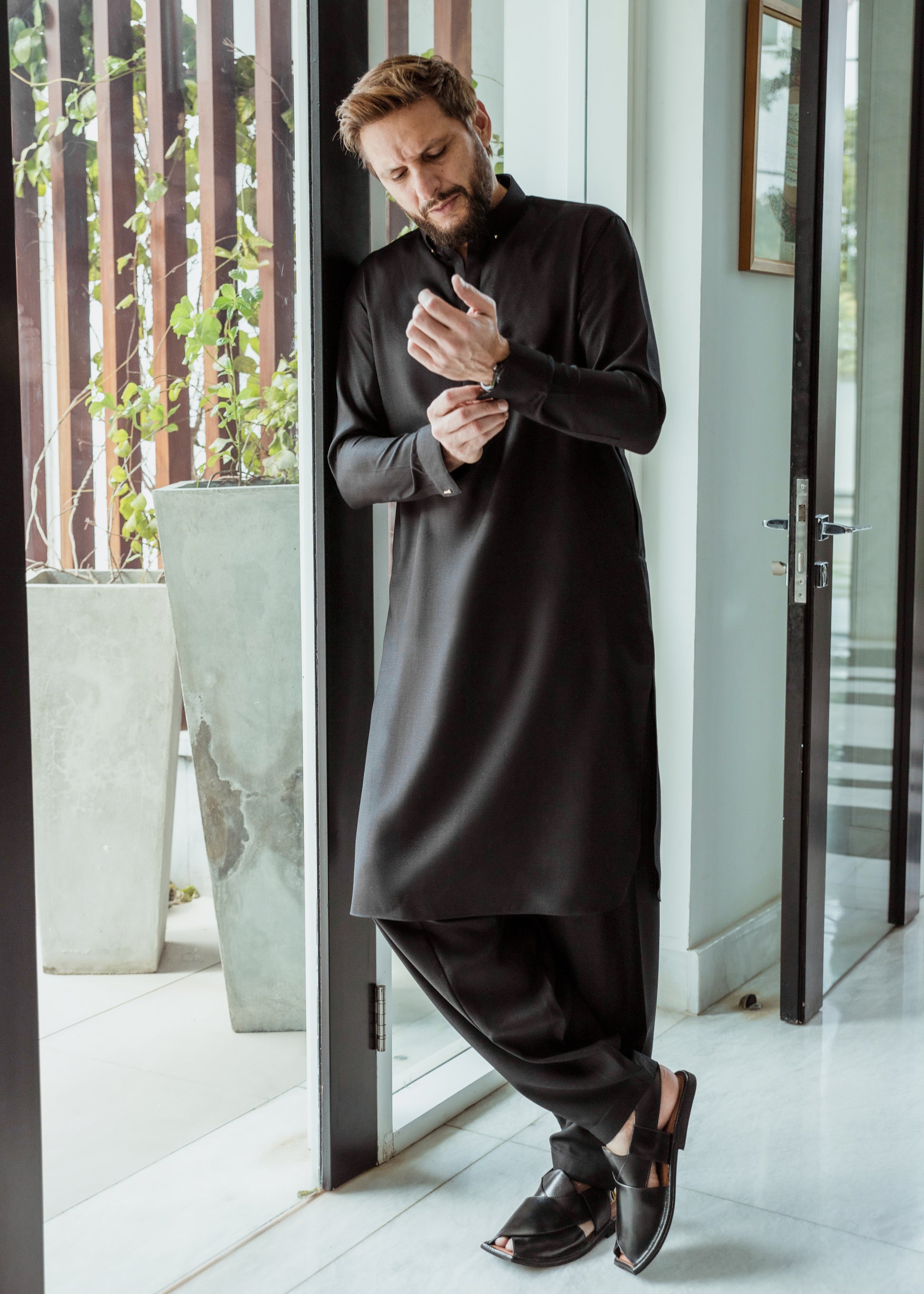 Our Black Kameez Shalwar features a unique button-down collar and is distinguished by metallic gold rivets, accessory, and buttons adding a touch of luxury against the black fabric. This attention to detail makes the outfit ideal for occasions requiring a subtle yet impactful appearance. Paired with a shalwar, the ensemble offers a perfect balance of sophistication and ease, making it a must-have addition to your wardrobe.