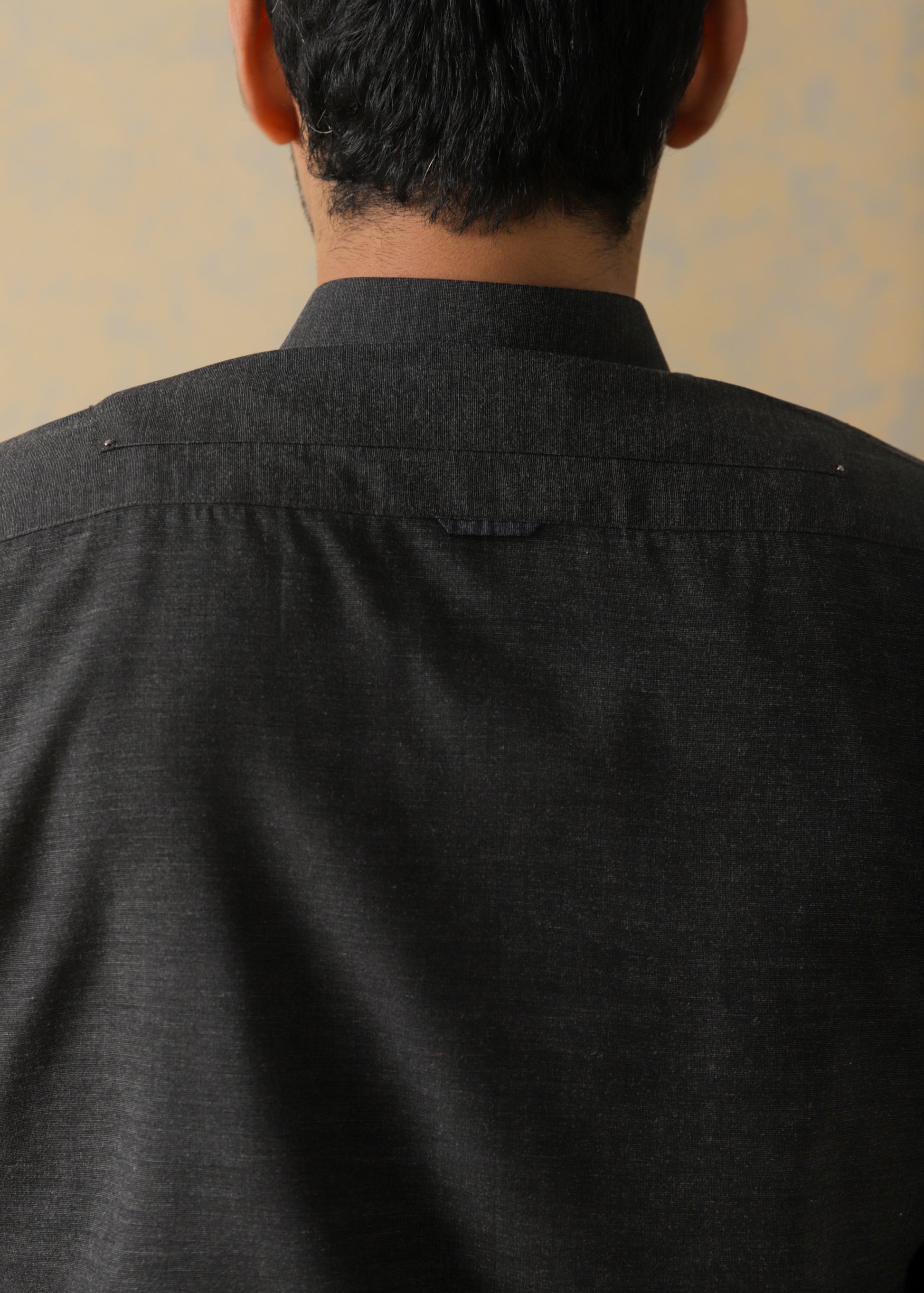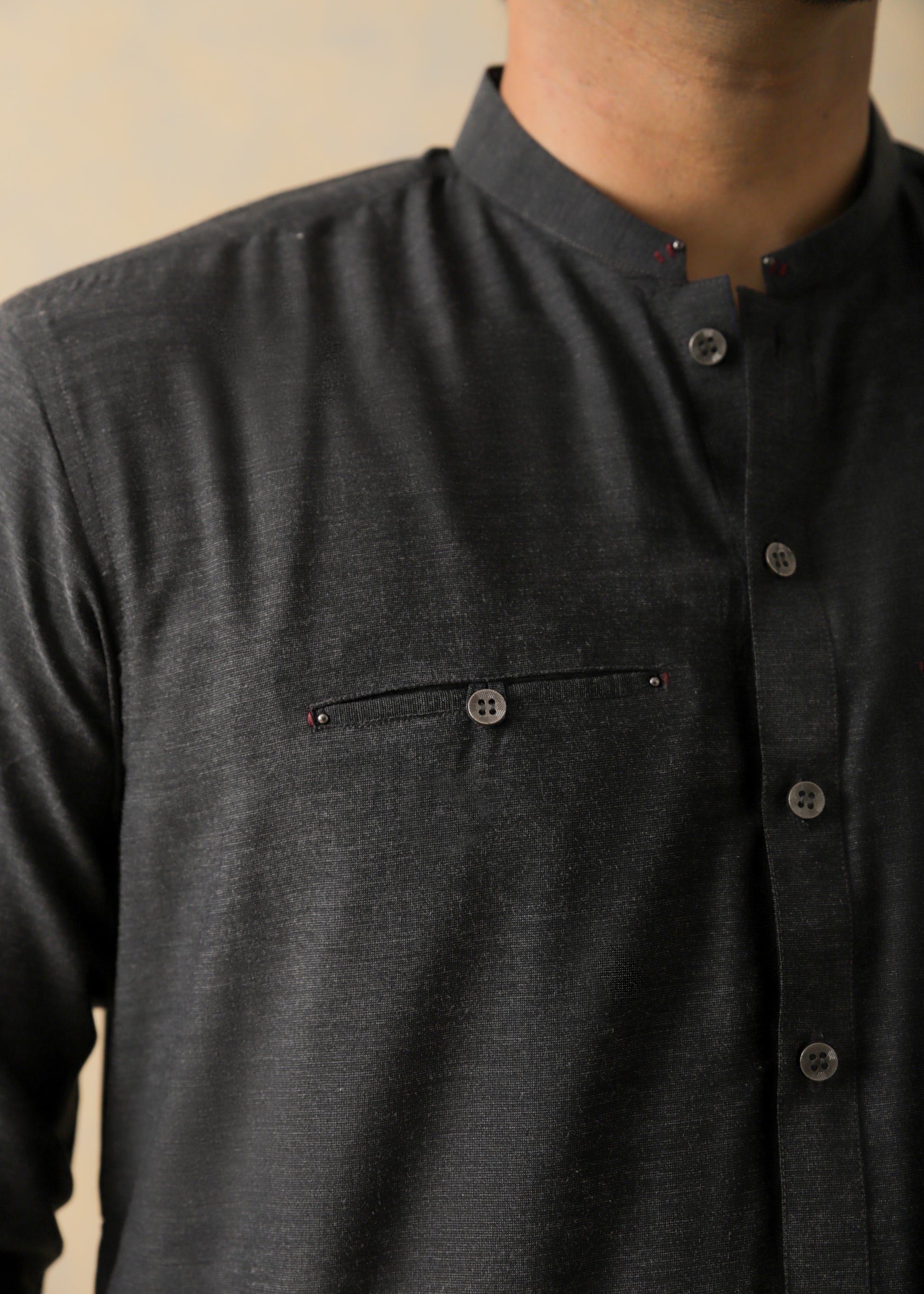 This all-black ensemble, made of high-quality cloth, has a double bone-pocket kurta with metallic buttons and a band collar. Enhanced with rivets and Bartek elements on the collar, plackets, pockets, and back yoke, as well as contrast fabric details on the sleeves and back yoke. This outfit blends sophistication and modern design when paired with a timeless pajama.