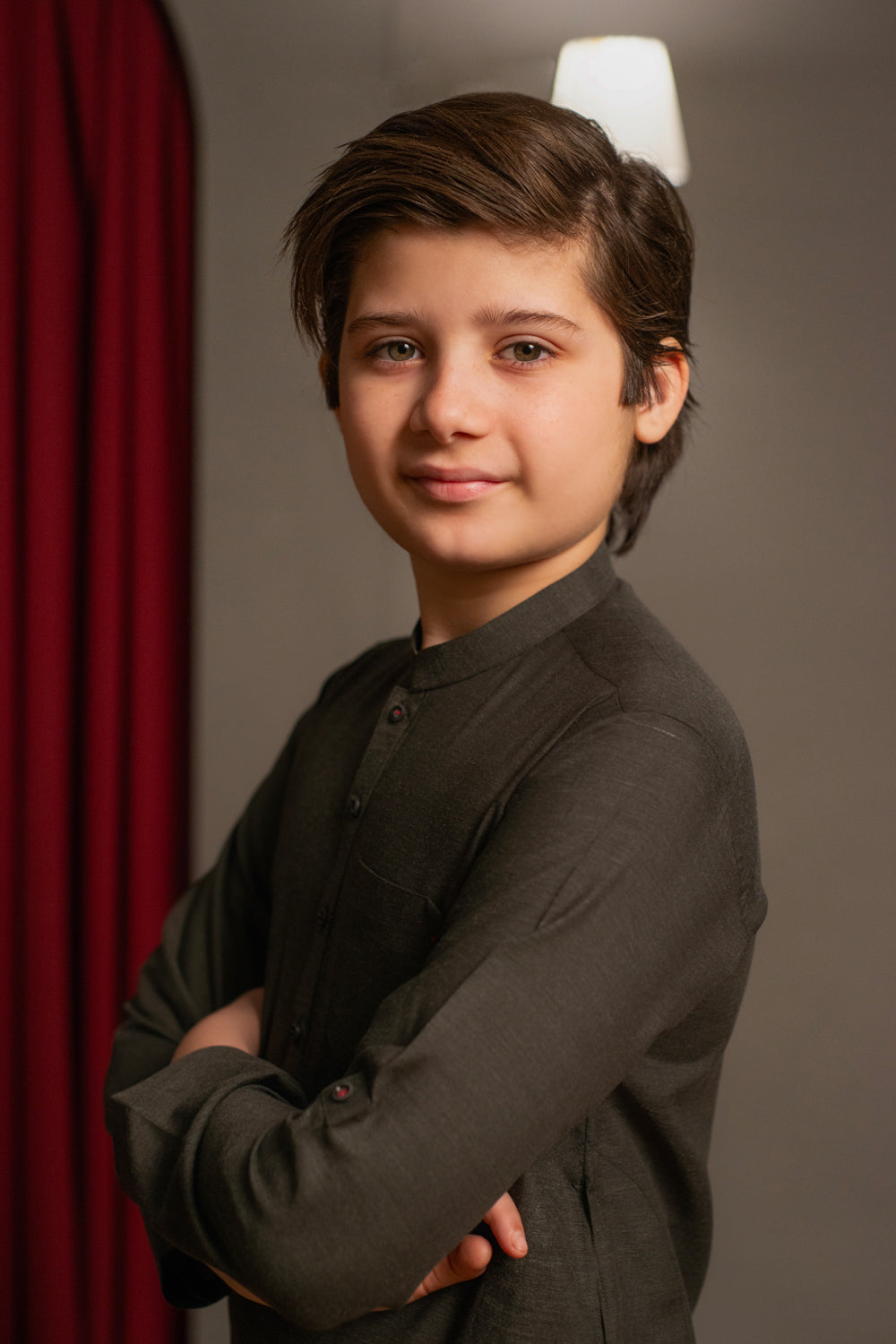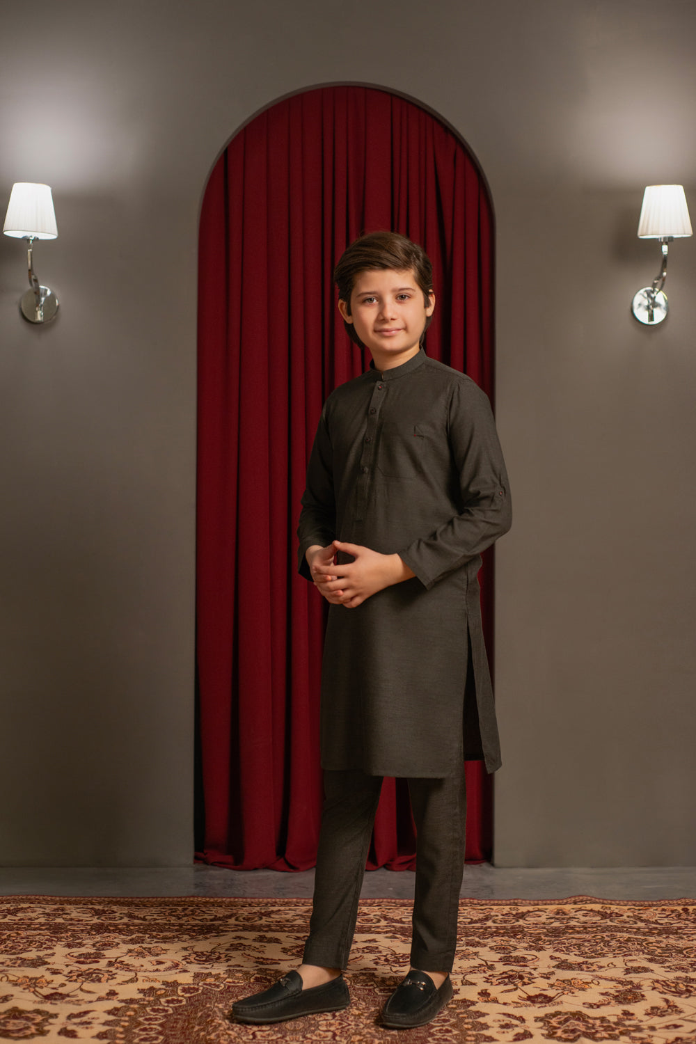 A charcoal brown two-tone kurta pajama for kids, featuring a band collar with a clean straight hem and round sleeves for a comfortable fit. The front pocket and buttons are highlighted with contrast red thread detailing, adding a subtle pop of color to the look.