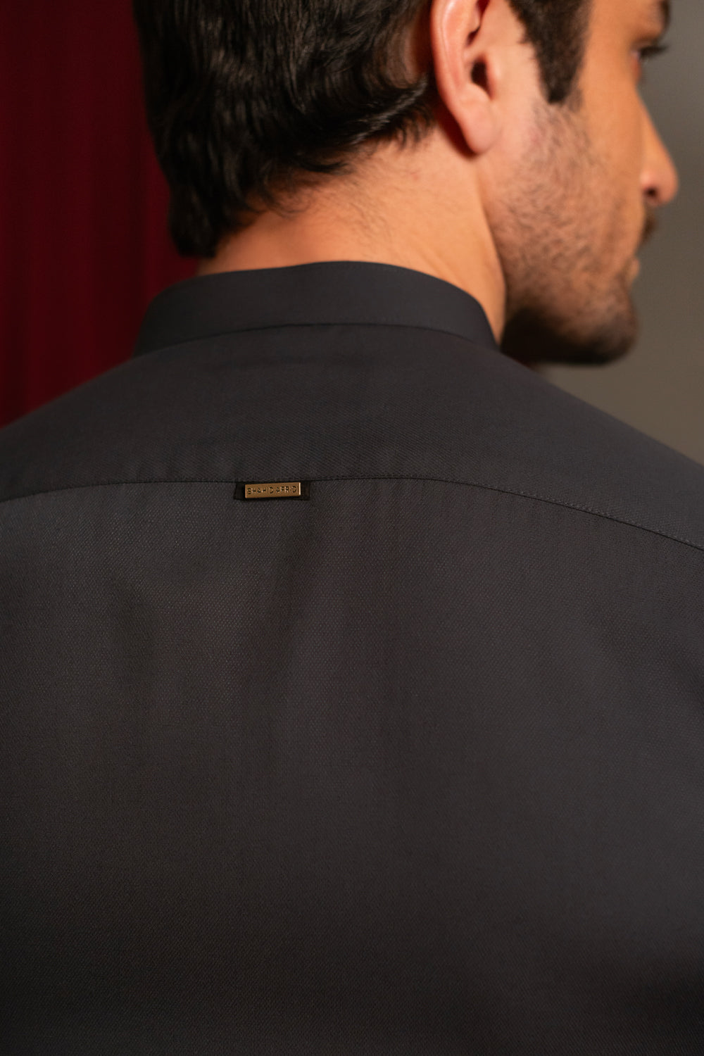 A charcoal gray designer kameez shalwar in dobby fabric featuring a band collar and straight hem, accented with black velvet detailing on the collar, cuffs, back yoke, and sleeve placket, along with rivet accents. Finished with a Shahid Afridi metal plate on the back yoke, the signature bat emblem on the left sleeve, and a distinctive accessory on the collar for a luxurious, signature look.