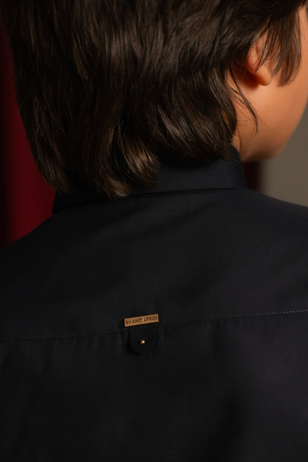 A contemporary charcoal green kameez shalwar for kids, featuring a smart shirt collar and double pockets with subtle buckle details for a modern look. Cut-and-sew panels with rivet accents on the shoulders and back yoke add structure and style. Finished with a Shahid Afridi metal plate on the back yoke and a bat emblem on the left sleeve for a signature touch.