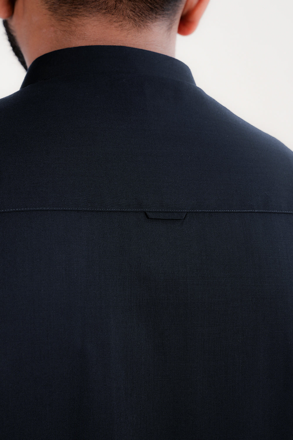 Experience unmatched elegance with this dark blue kameez shalwar, featuring a signature bat emblem for a distinctive touch. Crafted from premium wash 'n' wear fabric, it showcases a sleek band collar, cuffs, and straight hem, with detailed anchor thread accents on the placket, collar, and cuffs. Gunmetal buttons and rivet details on the collar and shoulder give it a modern, edgy appeal.