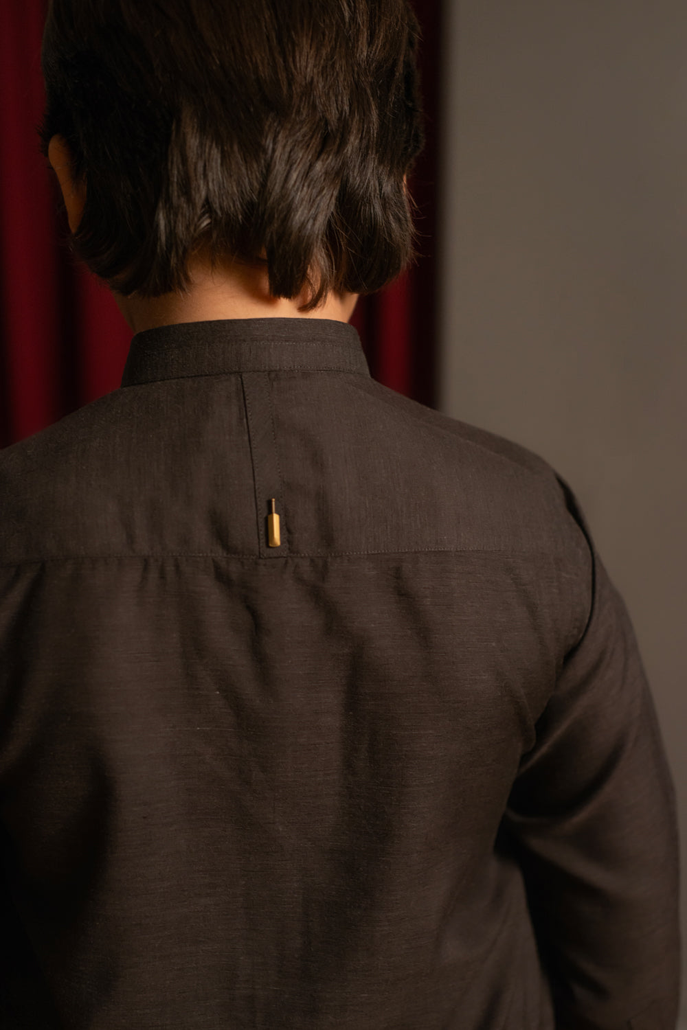 A dark chocolate two-tone kameez shalwar with a band collar, cut cuffs, and straight hem, styled with rivet accents and cut-and-sew panels. Finished with metallic buttons, a Shahid Afridi metal plate on the front, and a bat emblem on the back yoke.