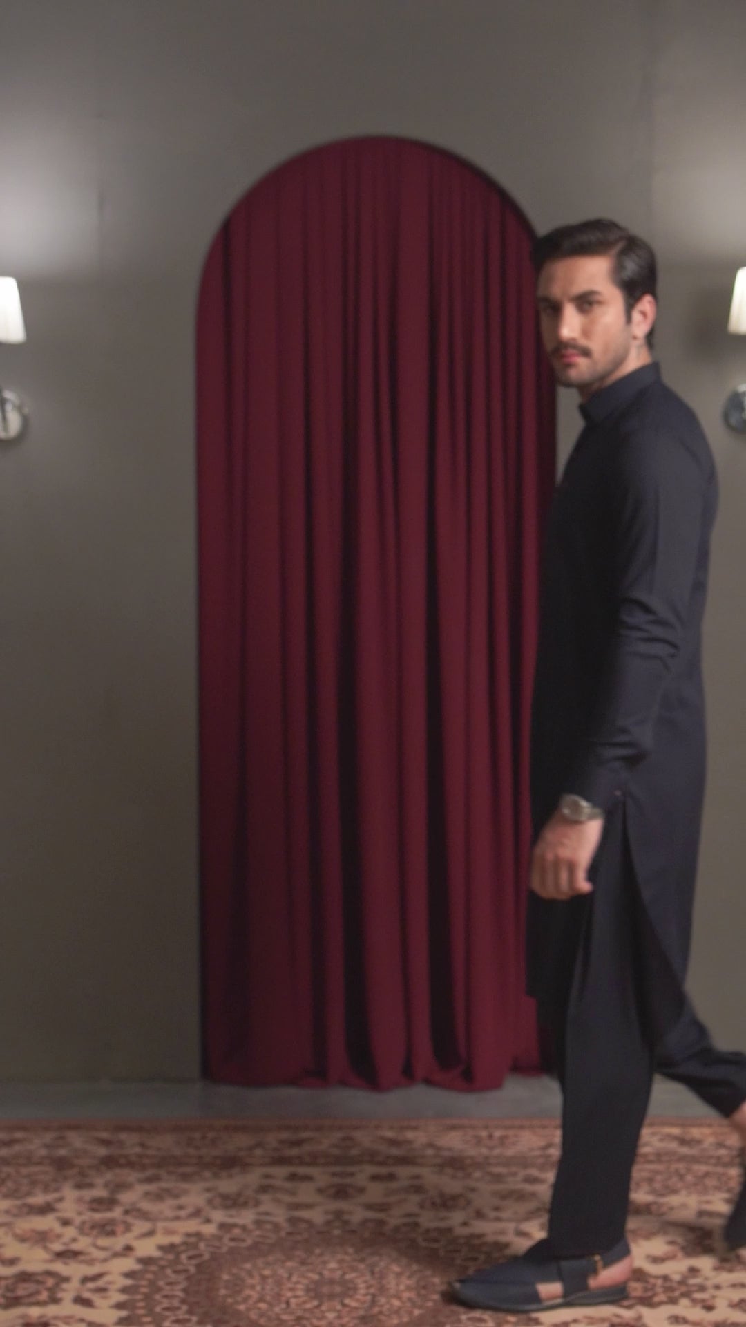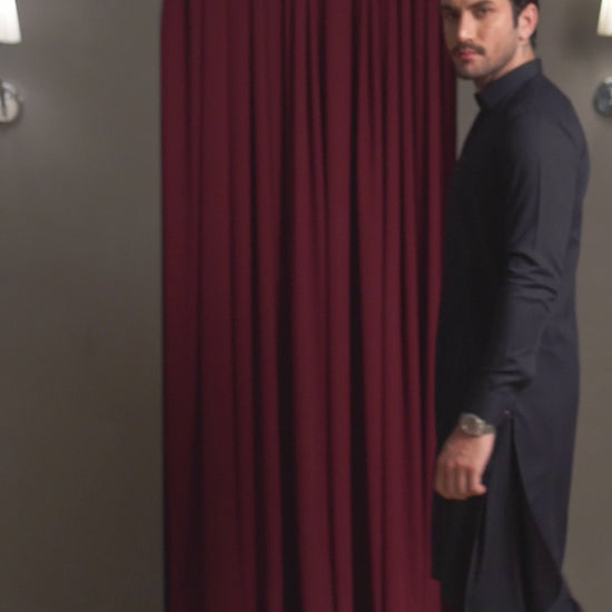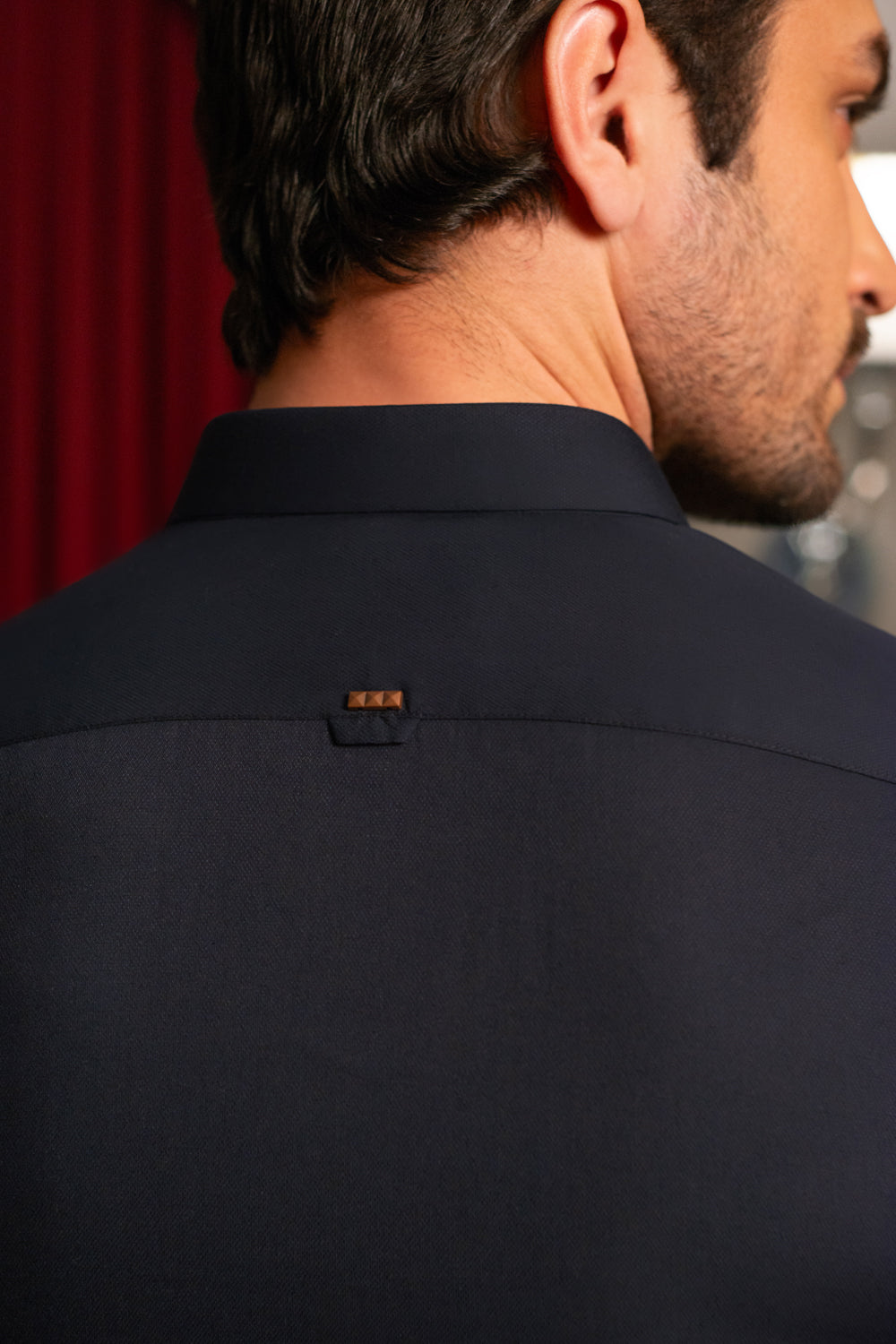 A dark navy designer kameez shalwar in dobby fabric featuring a classic shirt collar and round hem, finished with copper metallic buttons. Enhanced with subtle accessory detailing on the front and back yoke for a sophisticated, signature look.