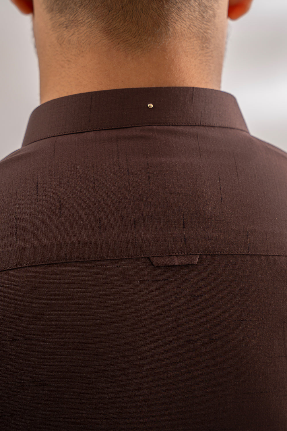 A sophisticated deep brown shalwar kameez in viscose slub fabric, featuring signature bat emblem with a cut band collar, cuffs, and a straight hem. Matching buttons and gold rivet details adorn the front, sleeve placket, and collar back for a refined finish.
