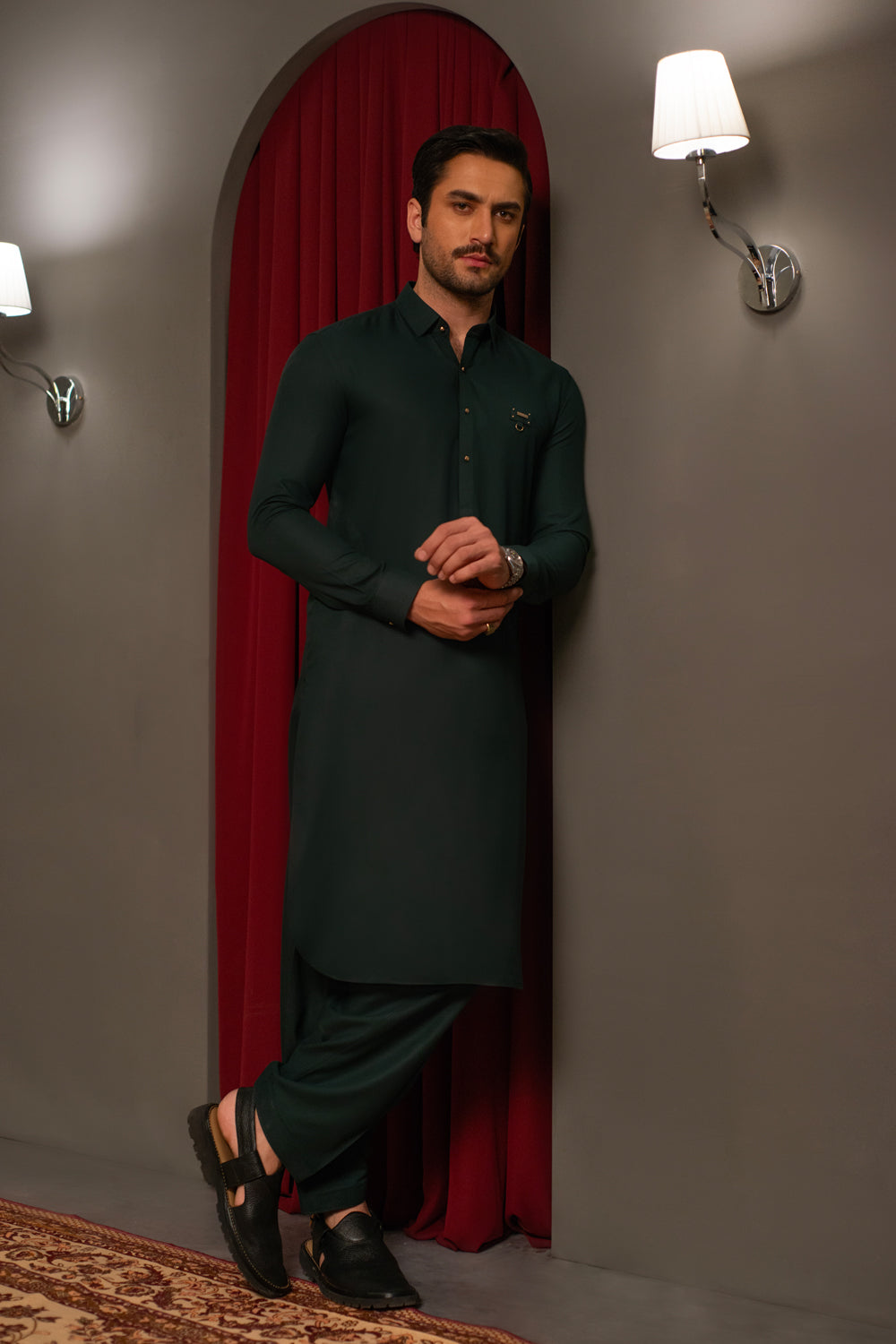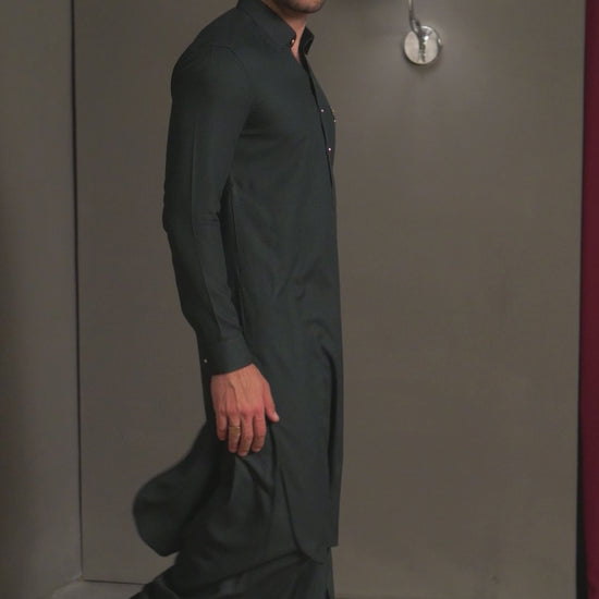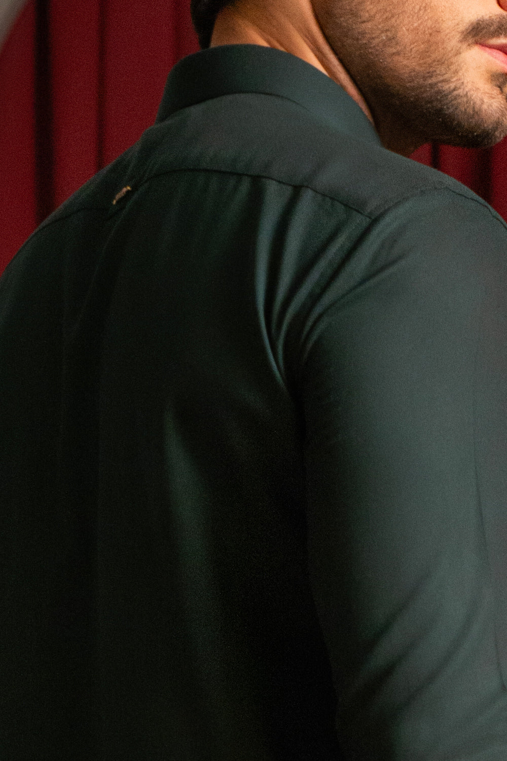 A forest green kameez shalwar crafted in wash-n-wear crepe fabric, featuring a classic shirt collar and round hem, finished with gold buttons. Designed with cut-and-sew detailing on the front accented by a gold buckle and Shahid Afridi metal plate, and on the back yoke with signature cut-and-sew detail and bat emblem for a refined, elegant finish.