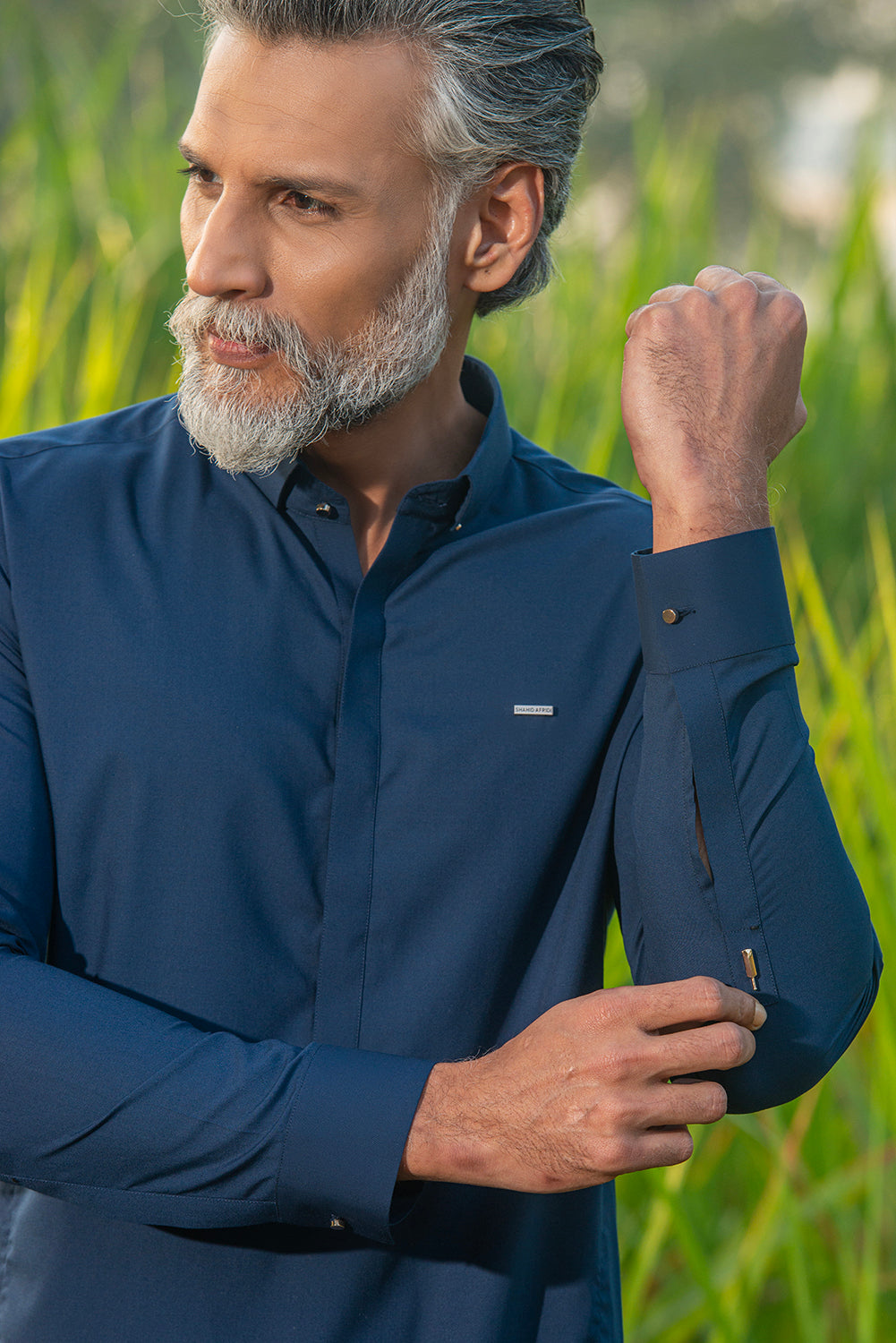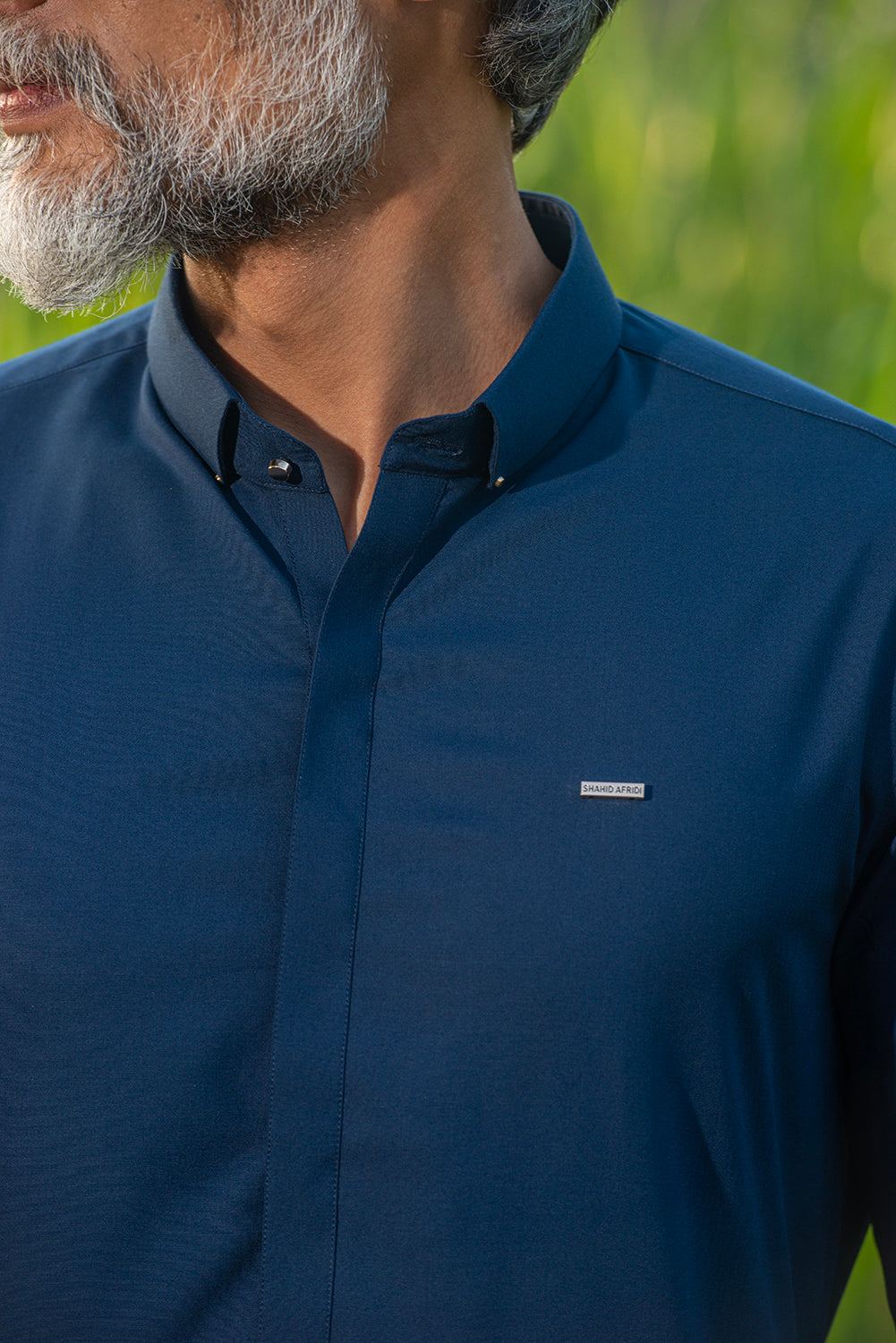 It features a stylish shirt collar with rivet details and a round hem for a modern touch. Metallic gold buttons complement the Shahid Afridi metal plate on the front, adding a signature appeal. The sleeve placket is adorned with signature bat emblem, enhancing its exclusive charm.