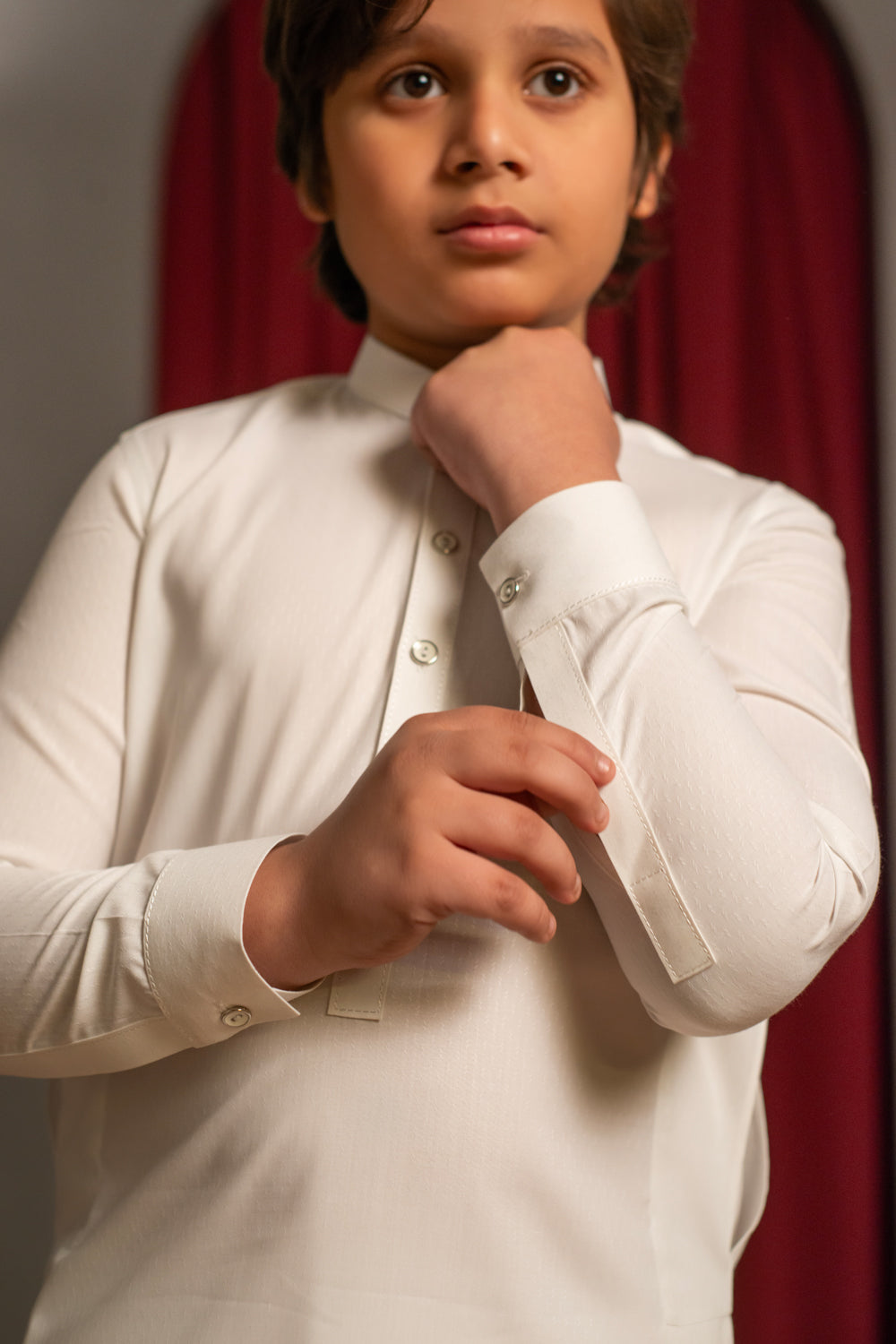 Crafted in off-white dobby fabric, this kurta pajama features a band collar and straight hem for a sharp, modern silhouette. The matching white and silver buttons enhance the overall sophistication. Finished with delicate anchor thread detailing on the shirt for a polished touch.