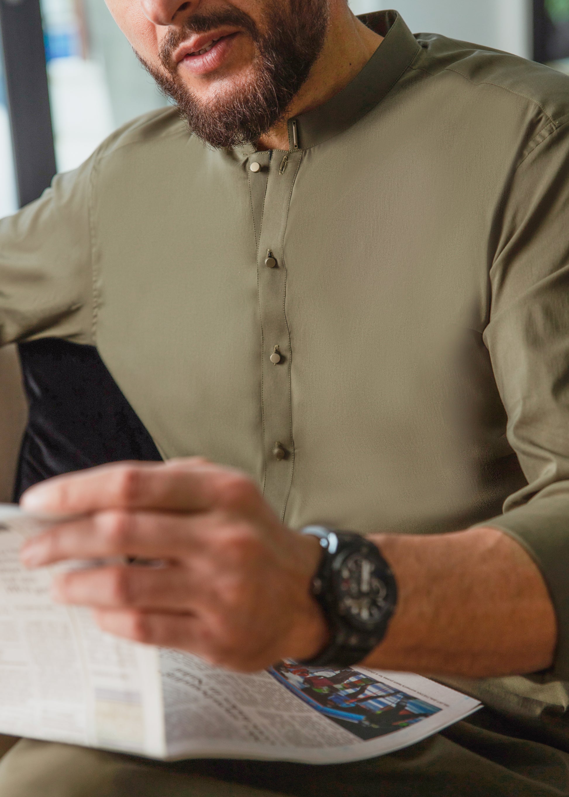 | Our Olive Green Kameez Shalwar featuring a band collar with accessory detail and contrast inside. The placket showcases cut detail and metallic round buttons, adding subtle elegance to the ensemble. The ensemble is elevated with contrast and accessory details on the cuffs and a box pleat on the back yoke. Finished with a square hem and paired effortlessly with a comfortable shalwar, this ensemble is a symphony of sophistication and vibrance. |