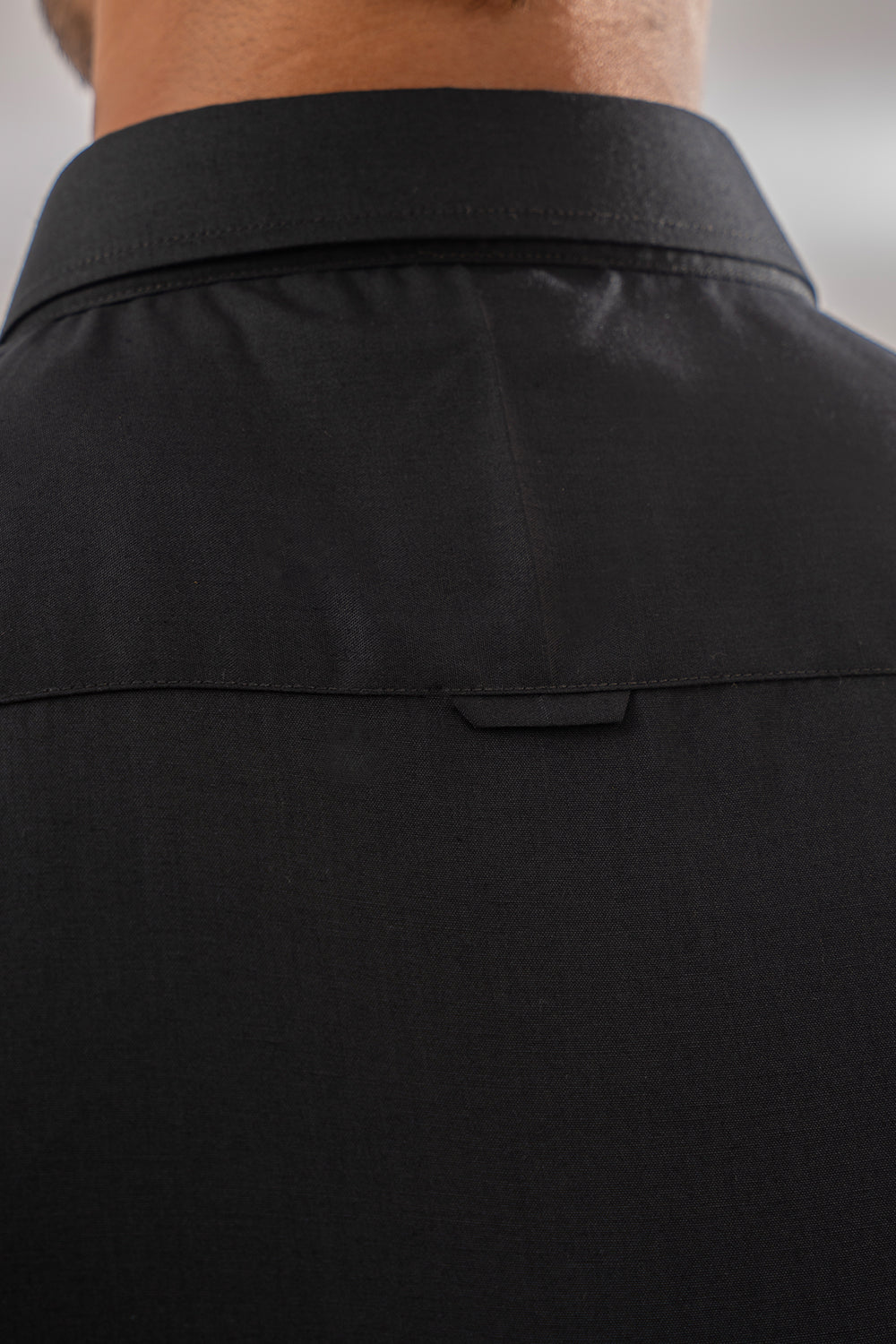 Onyx gray shalwar kameez in wash 'n' wear fabric features a corner-cut shirt collar with contrast buttons. Bar-tack detailing on the collar, front, and sleeve placket adds a sharp, contemporary touch to its sleek design.