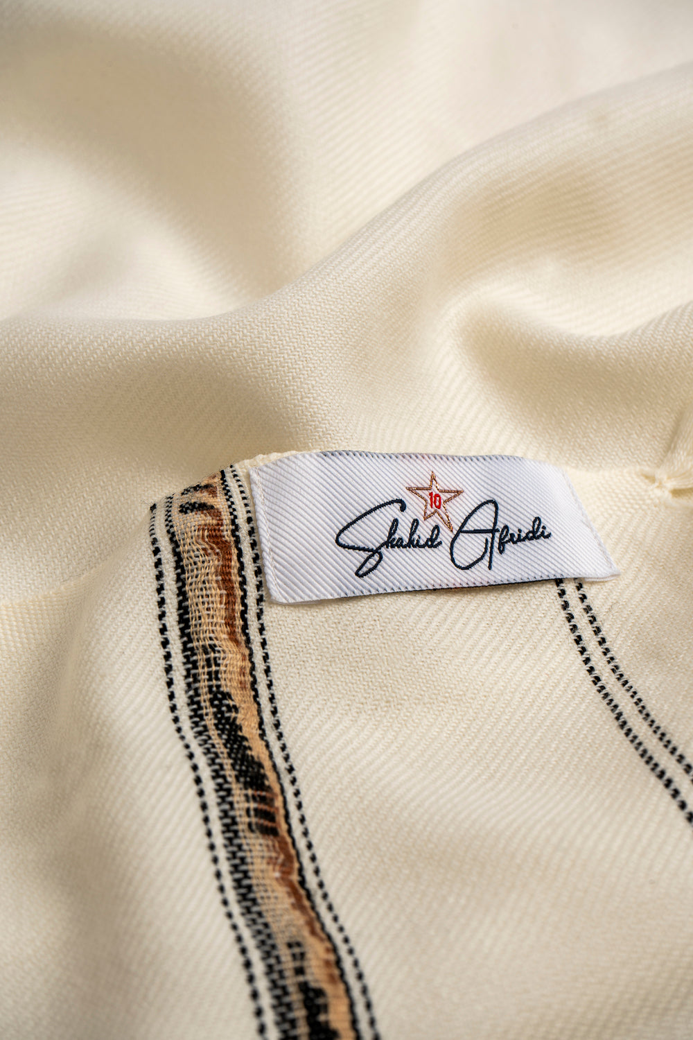 This exquisite twill woolen shawl in Off White features a beautifully crafted weaved border, lending it a touch of elegance. The soft, luxurious fabric ensures warmth and versatility, making it an ideal accessory for any wardrobe.